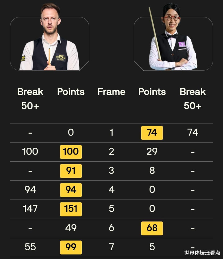 在特鲁姆普和吴安仪的比赛中,特鲁姆普打出了强势的状态。首局比赛中,吴安仪单杆打出74分完成一杆制胜并取得1-0的领先。第二局,特鲁姆普单杆打出100分以100:29扳回一城1-1战平吴安仪。